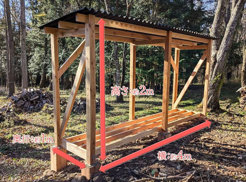 薪小屋のサイズは2種類とも、幅約4m ×  高さ約2m  × 奥行約1m です。